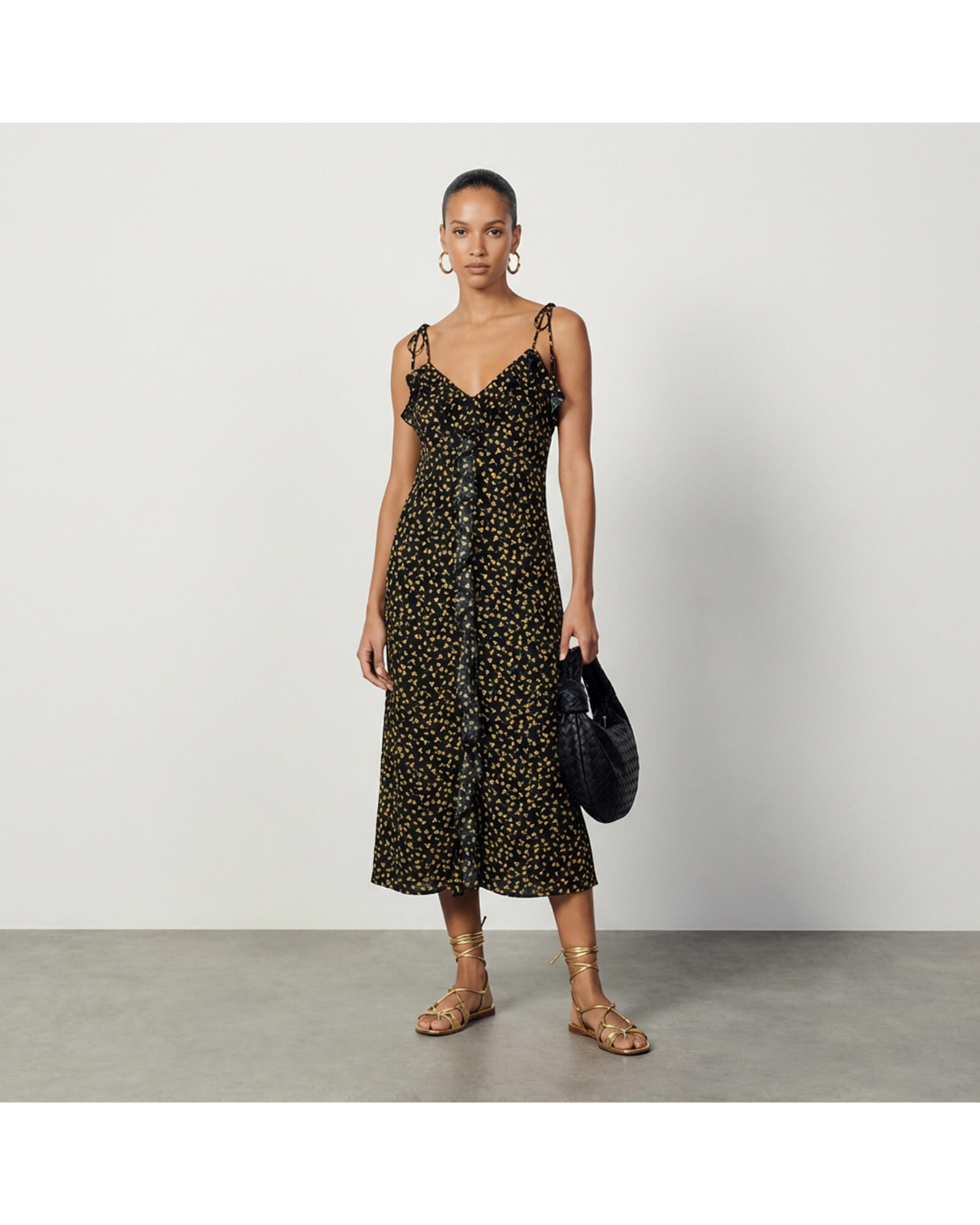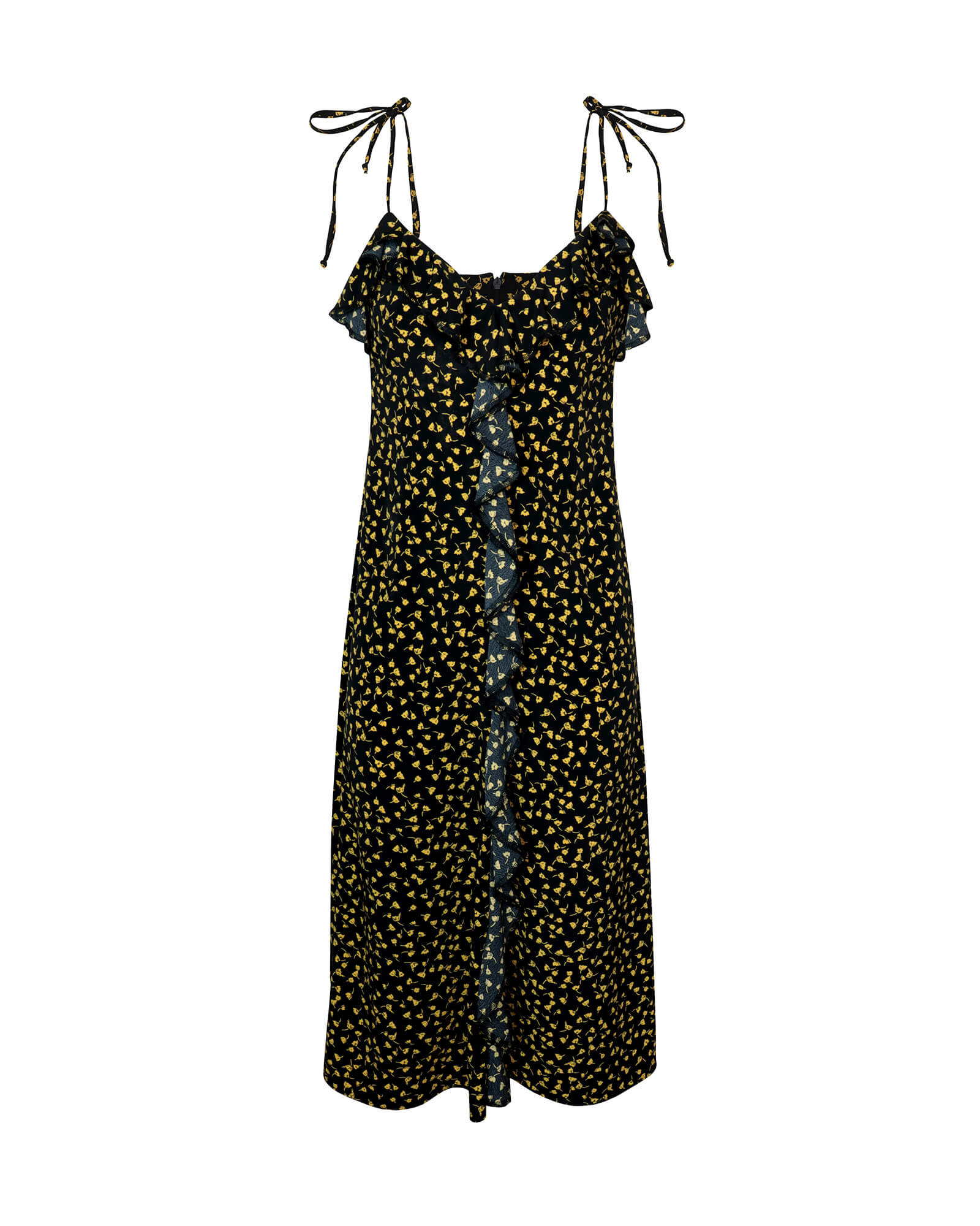 “Paola” dress is traced with flouncy ruffles throughout and is cut from floral print fabric. Made in midi length and is suspended from thin straps.